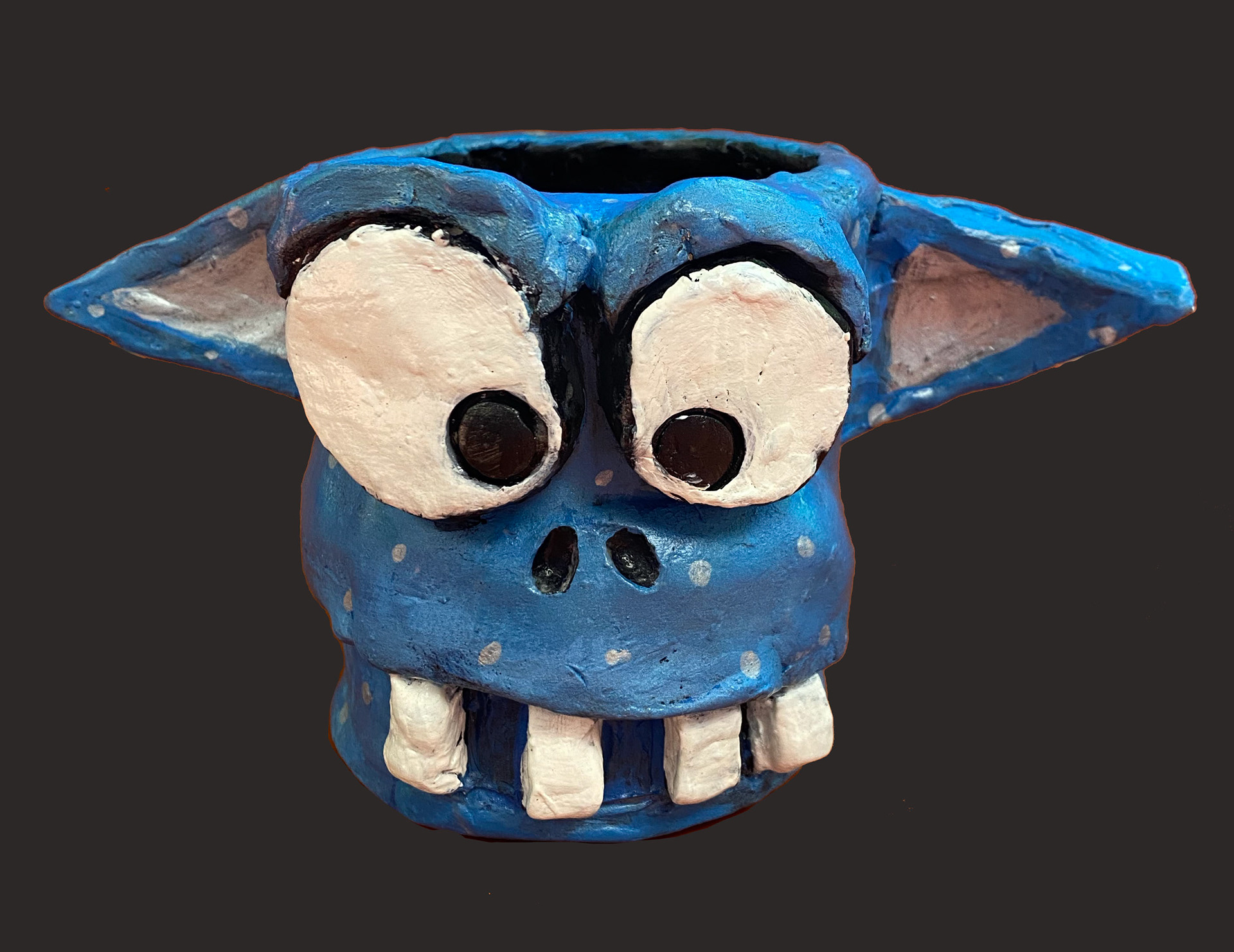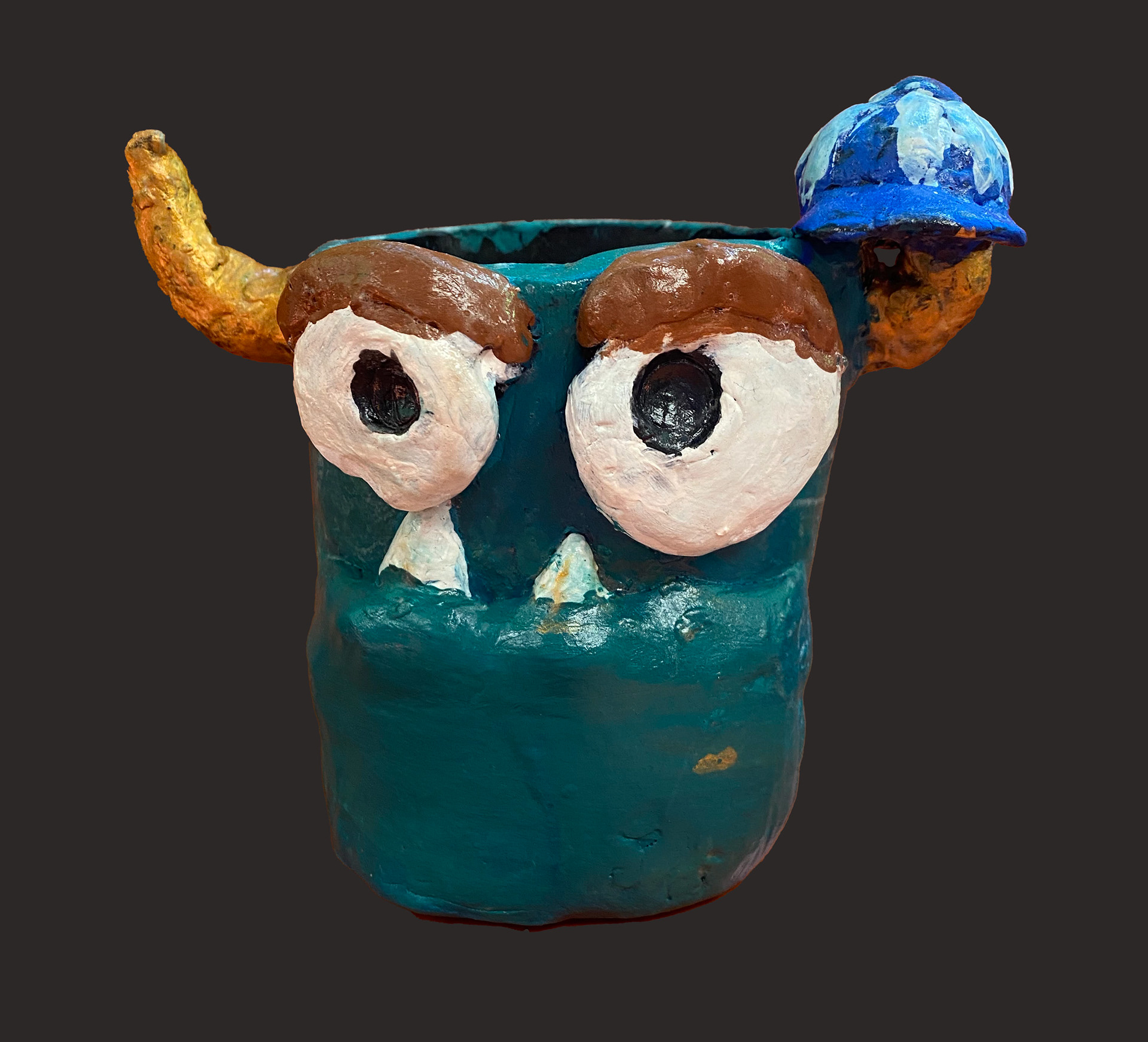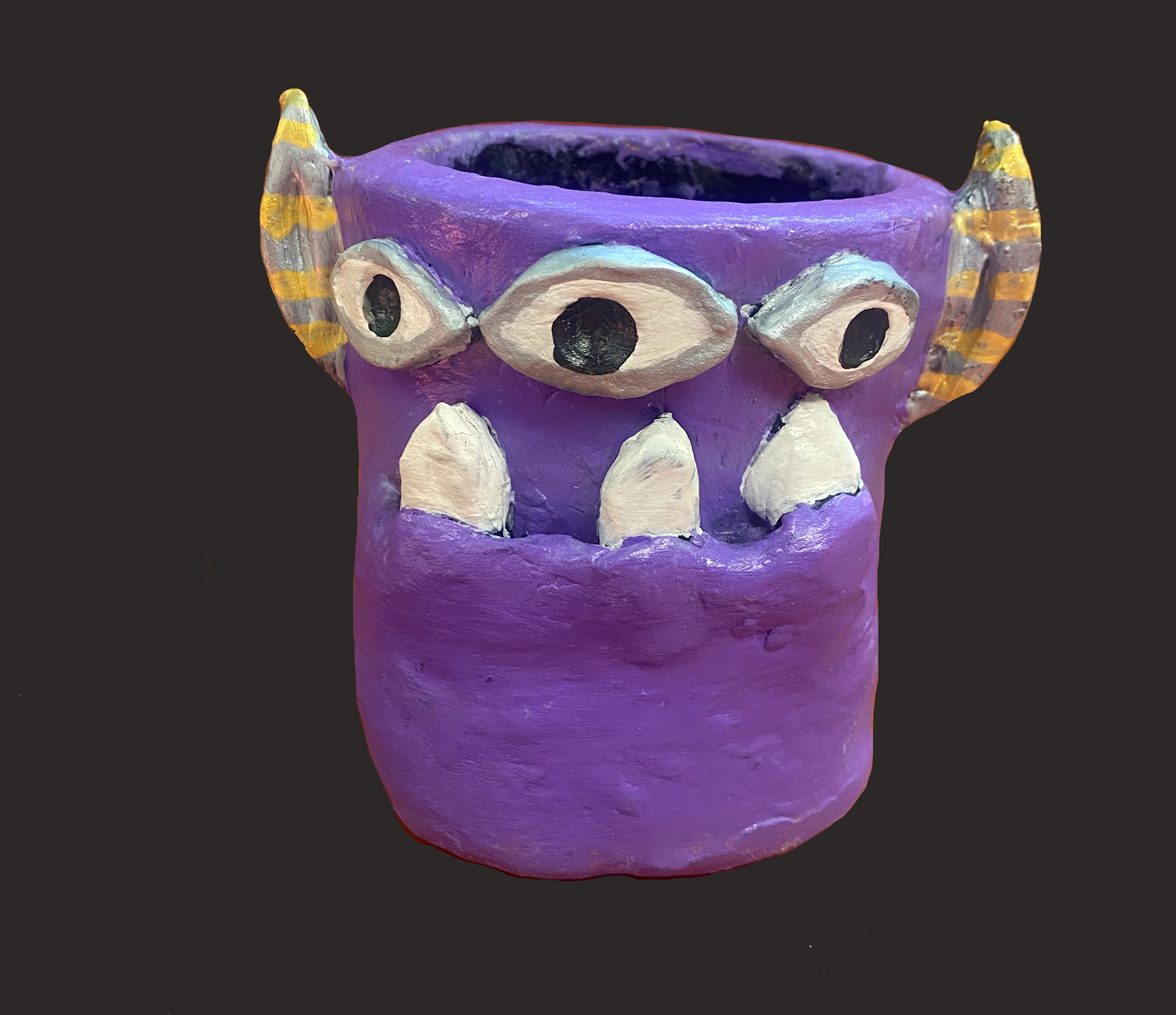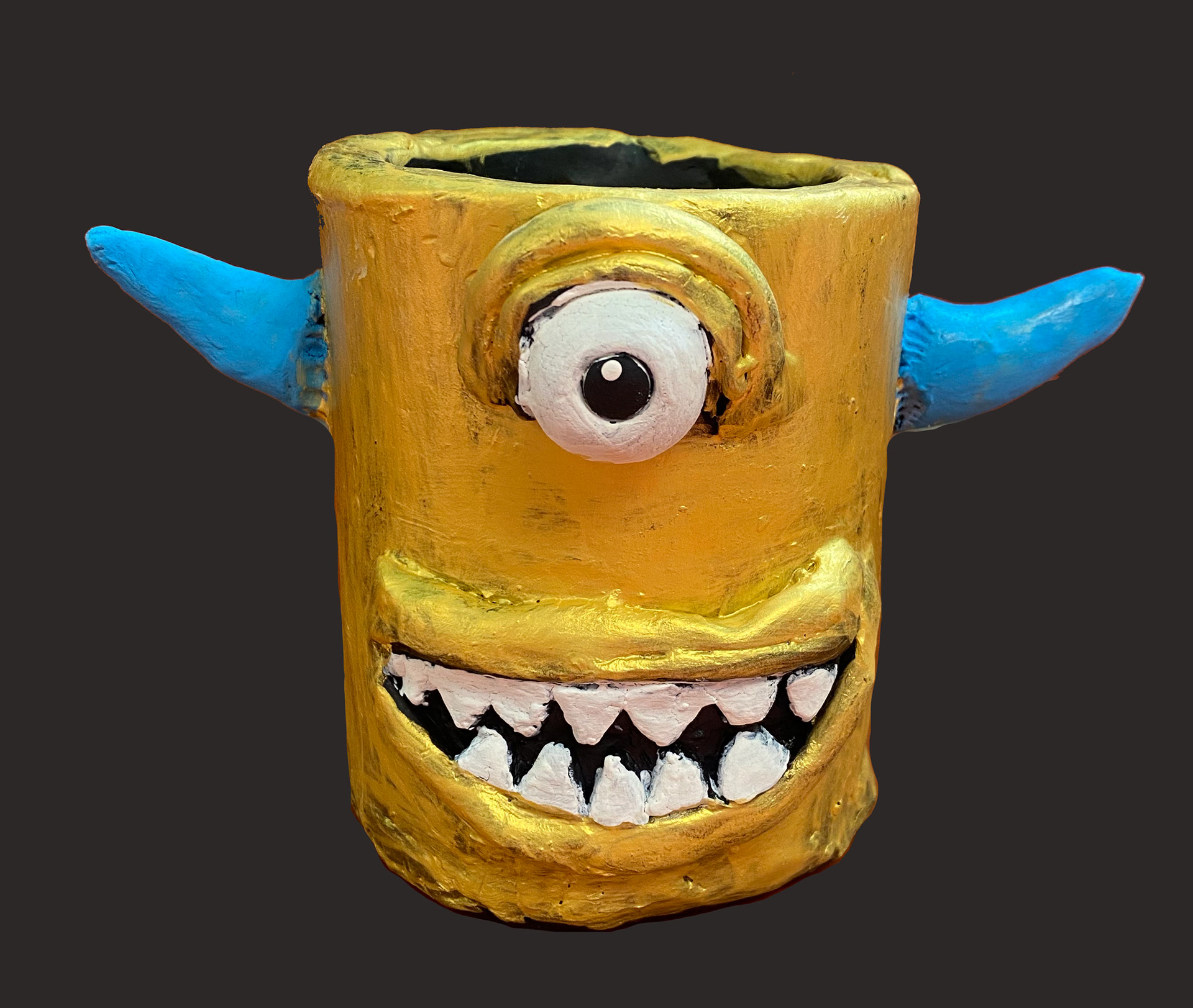 6th grade artists created monster mugs using ceramic slab building and sculpting techniques. Prior to working, clay students sketched out and colored their ideas.