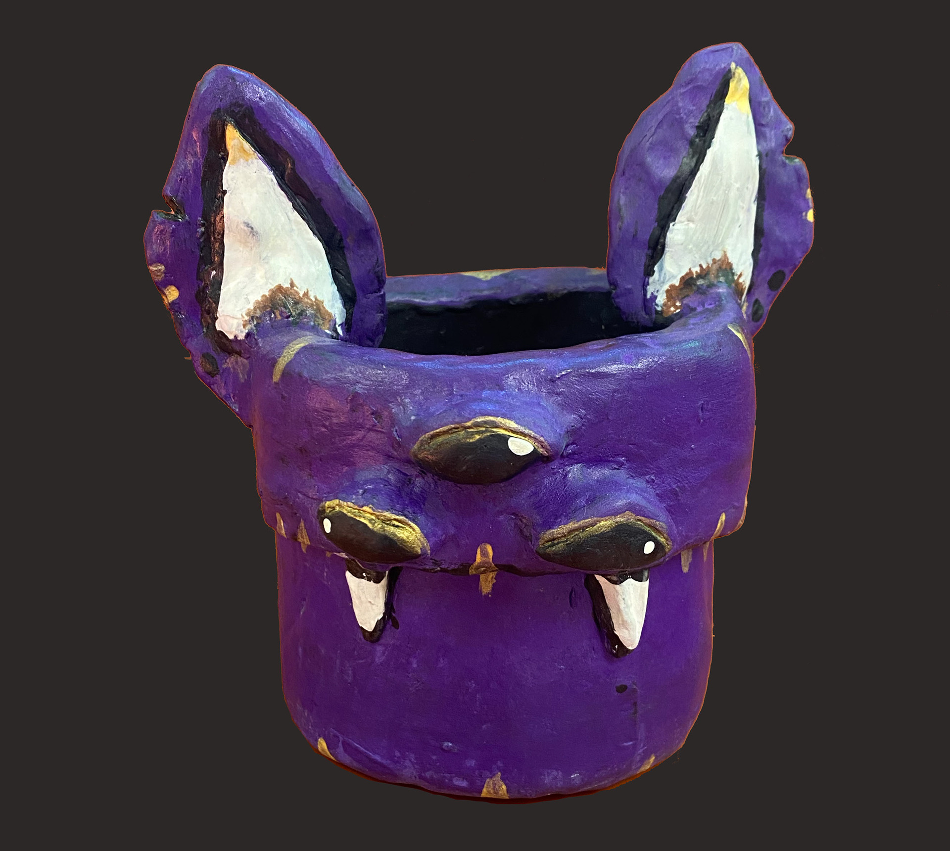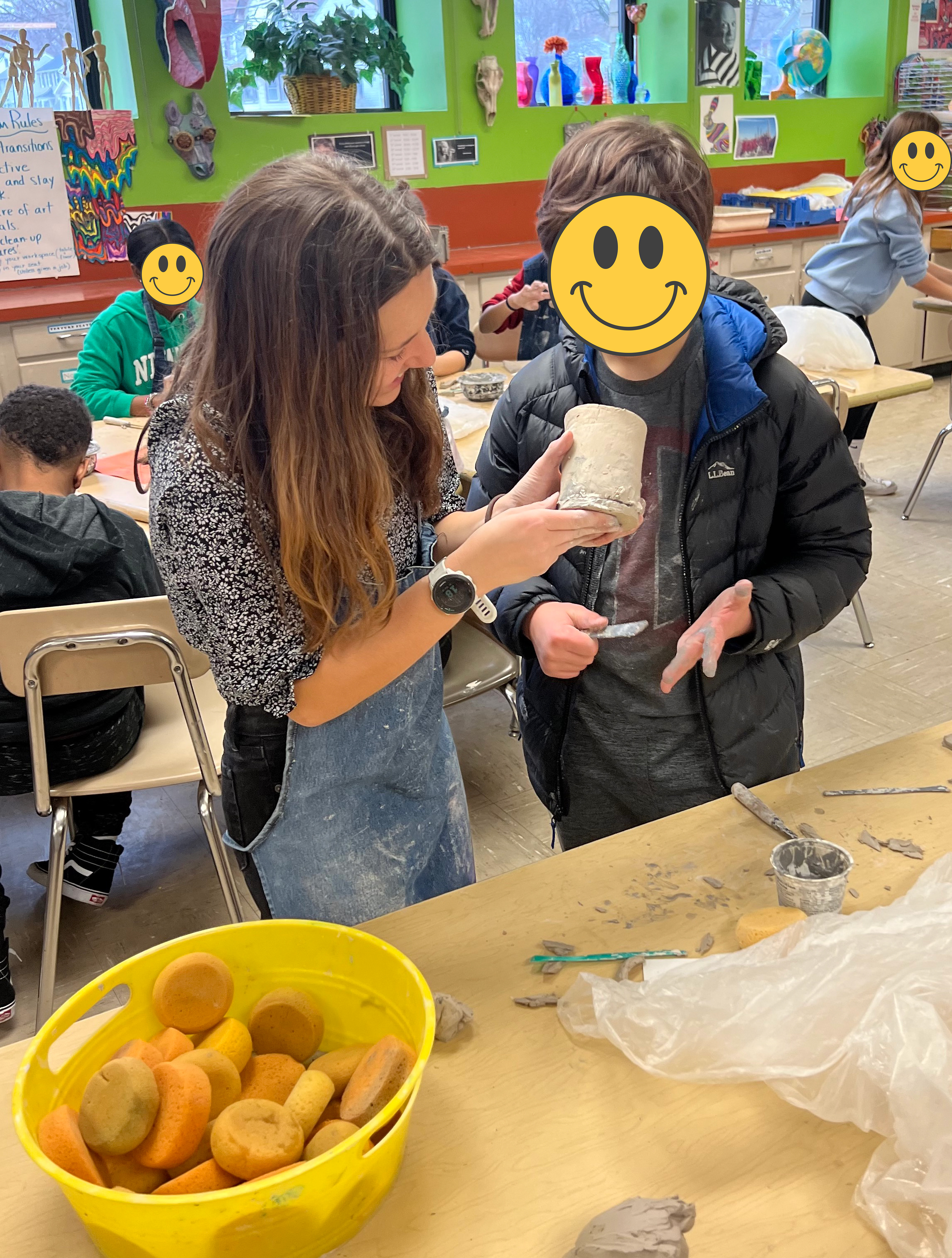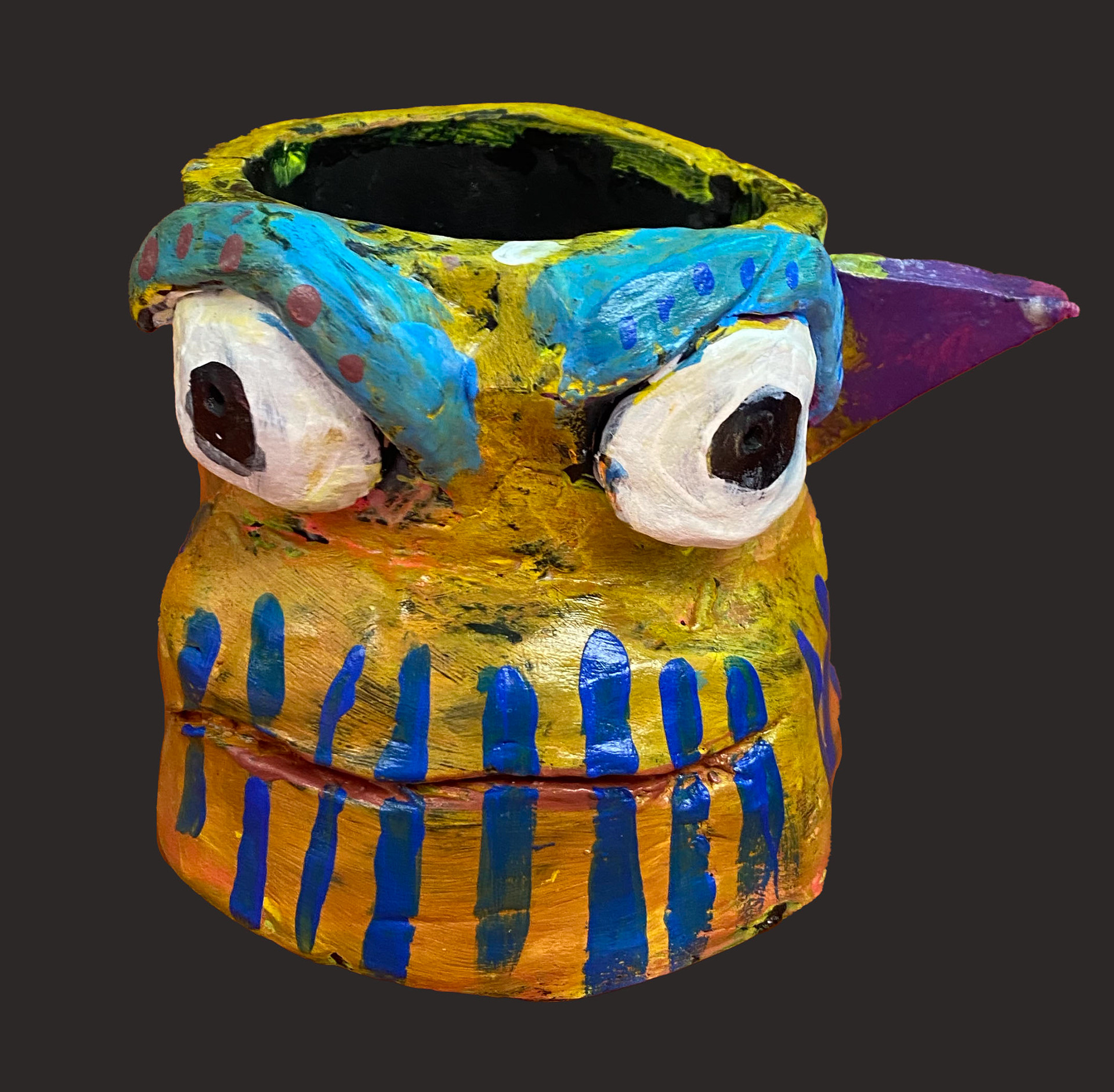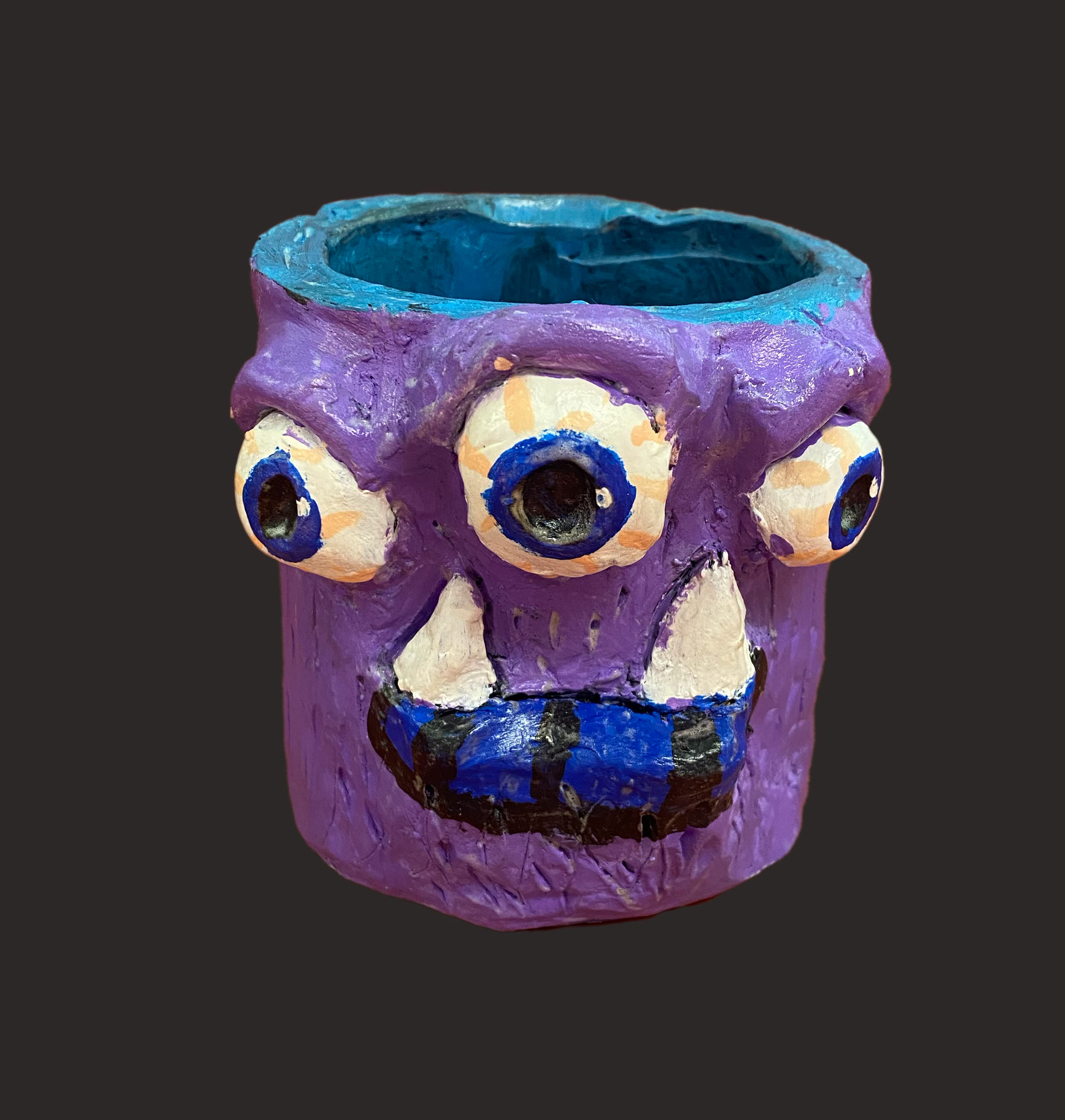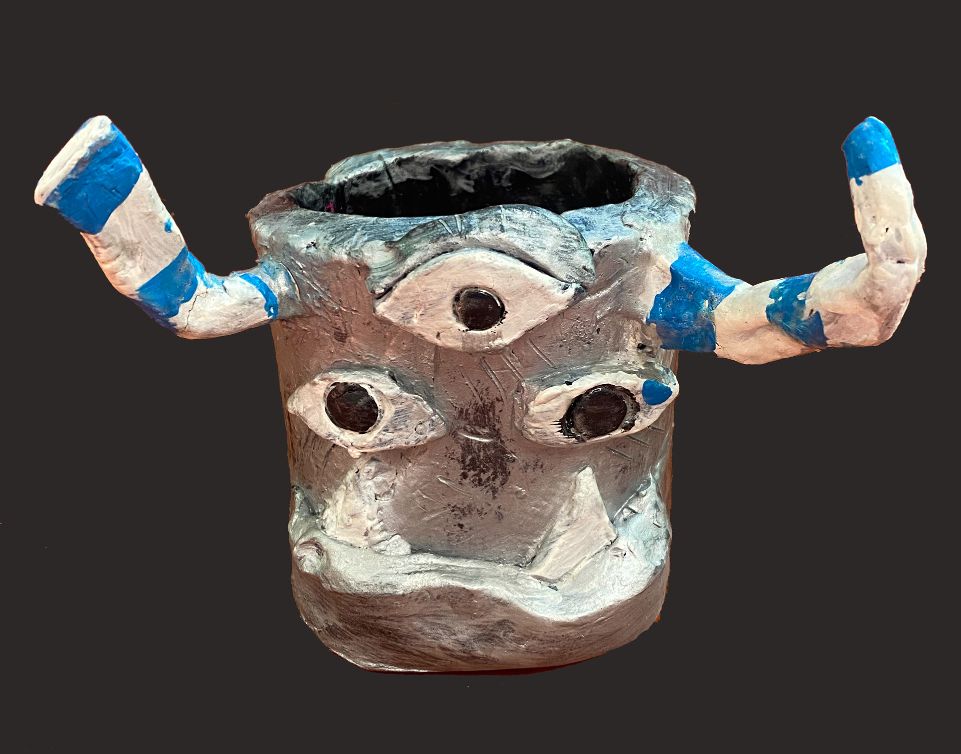 6th grade artists created monster mugs using ceramic slab building and sculpting techniques. Prior to working, clay students sketched out and colored their ideas.