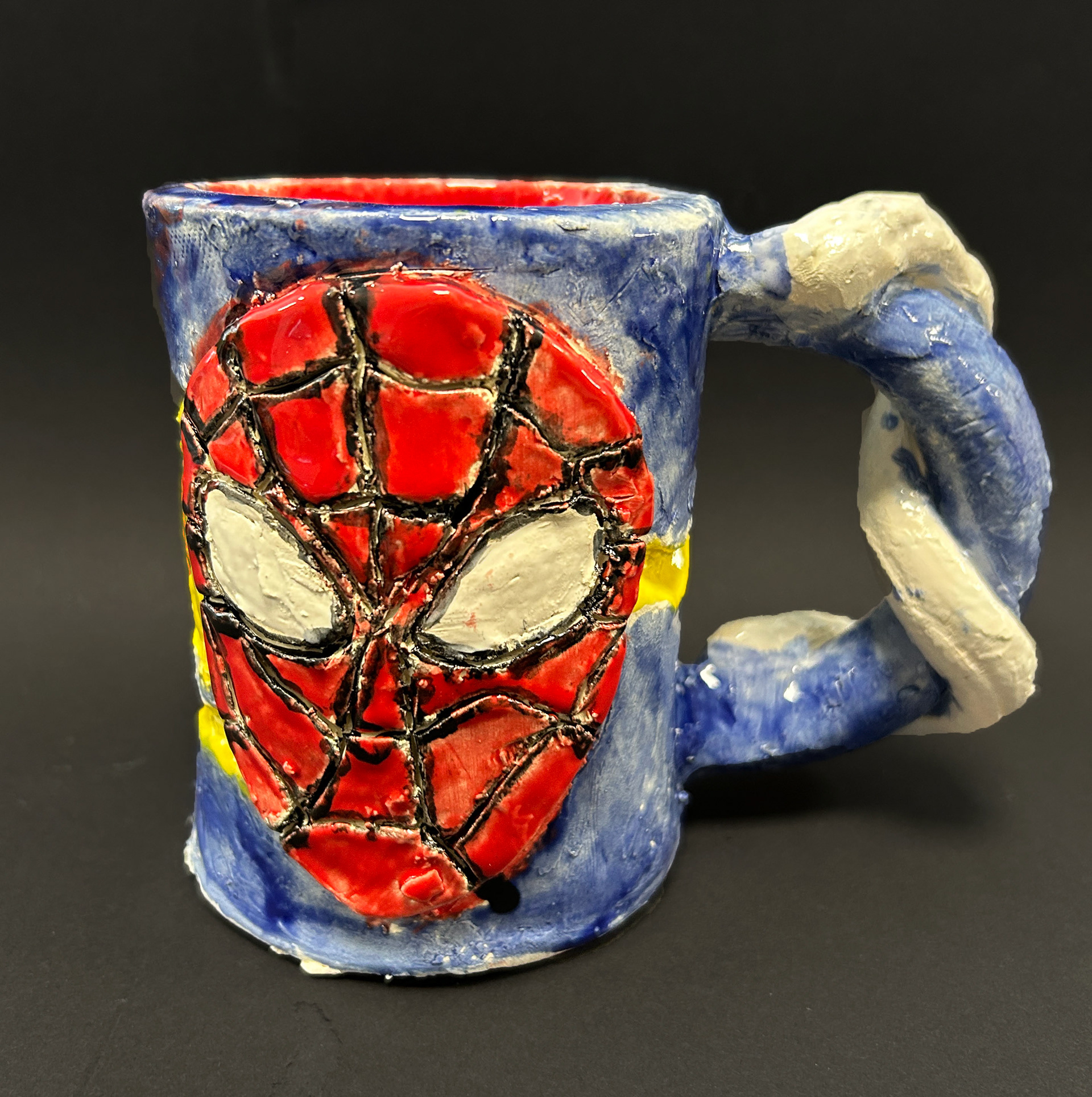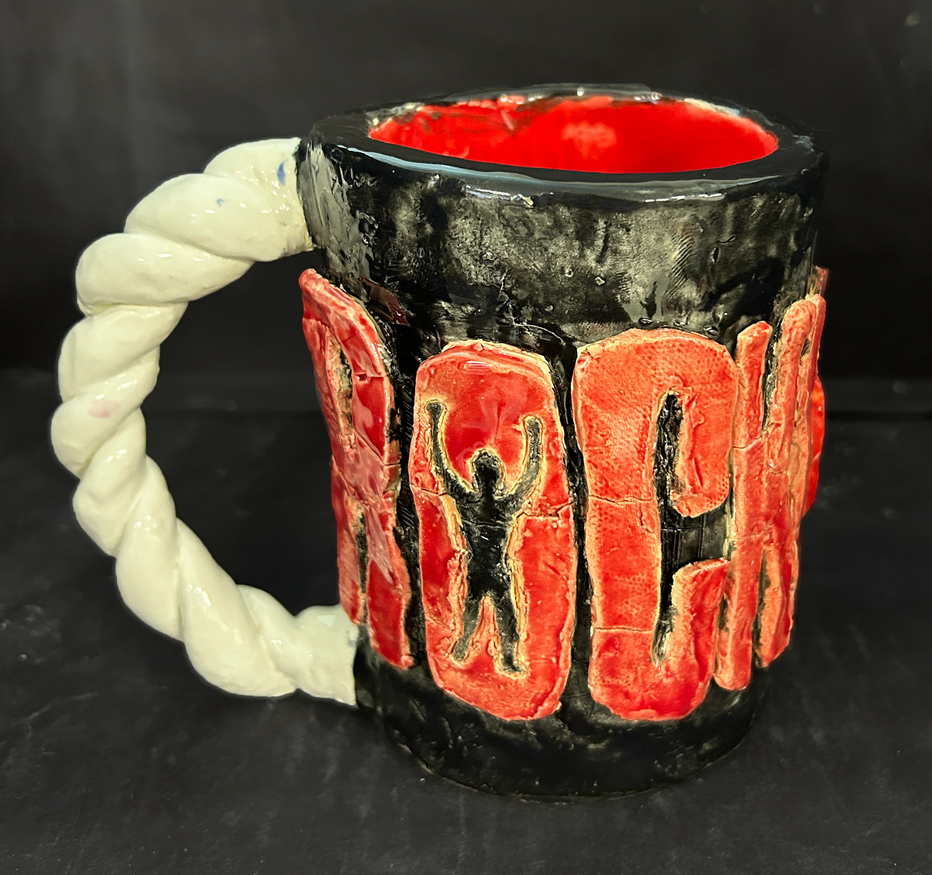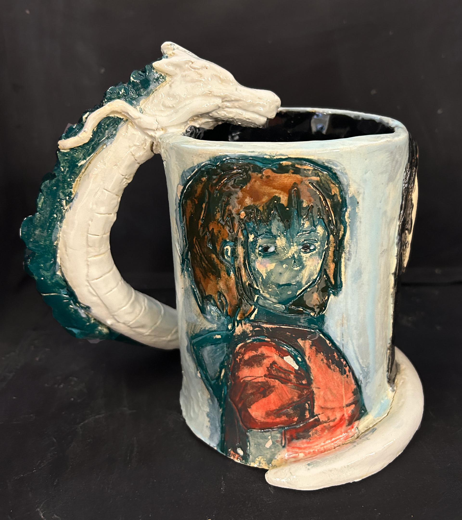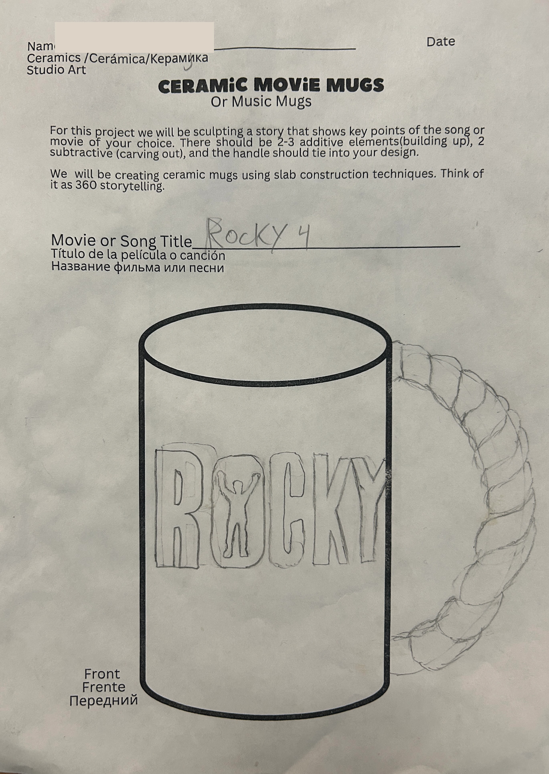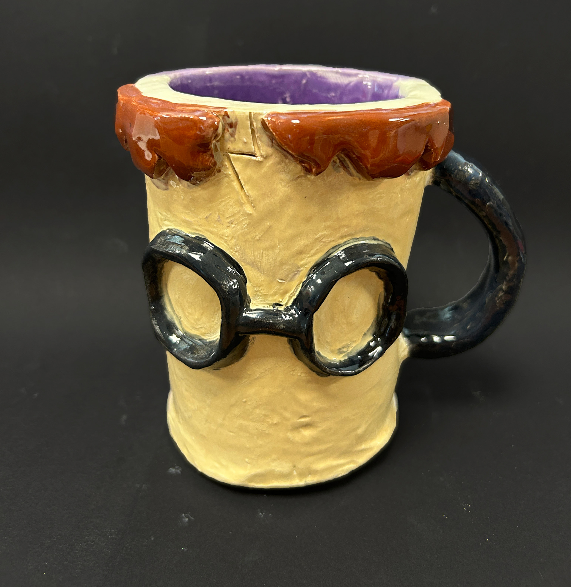Students constructed ceramic mugs using slab, coil, and pinch hand-building techniques. Prior to working on their mugs students had to pick a movie for inspiration and complete a sketch.