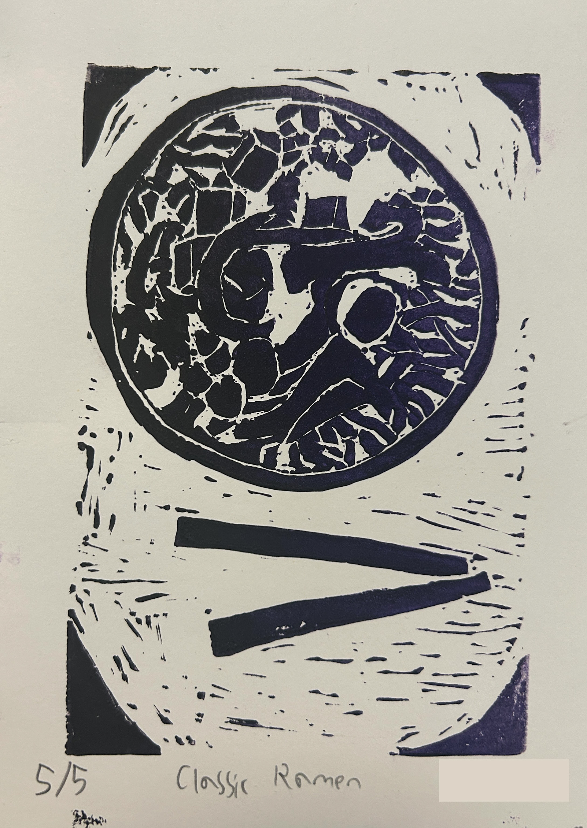 Students created prints inspired by food of their choices. Students had to chose a food that significance to them. They also had the opportunity to write and speak about the connection food has to memories and culture. In the ideation phase, students created three thumbnail sketches and one final sketch to be transferred. Students then used linoleum and carving tools to create this block prints.
